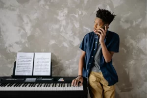 この角度だと、演奏者の表情も少し見えつつ、指のダイナミックな動きも伝わります。三脚がない場合は、本を積み上げたり、コップに立てかけたりして工夫するのも手ですが、100円ショップのスマホスタンドなどでも十分に安定した映像が撮れます。画面の端にちょっとした観葉植物やライトを映し込むと、一気に「バズる」動画の雰囲気に近づきますよ。